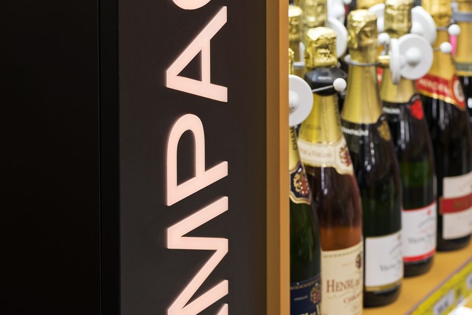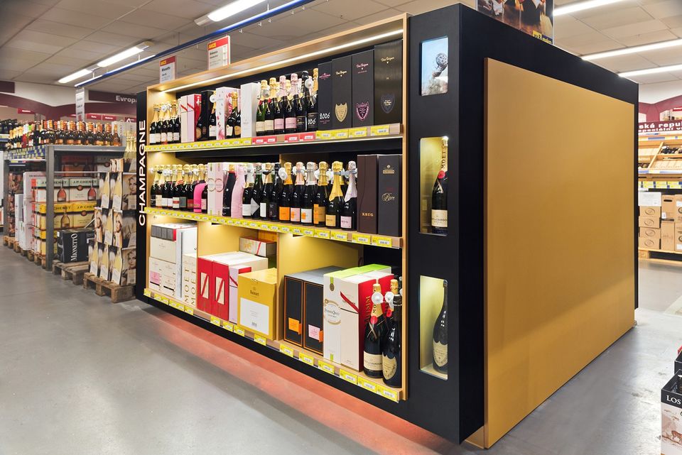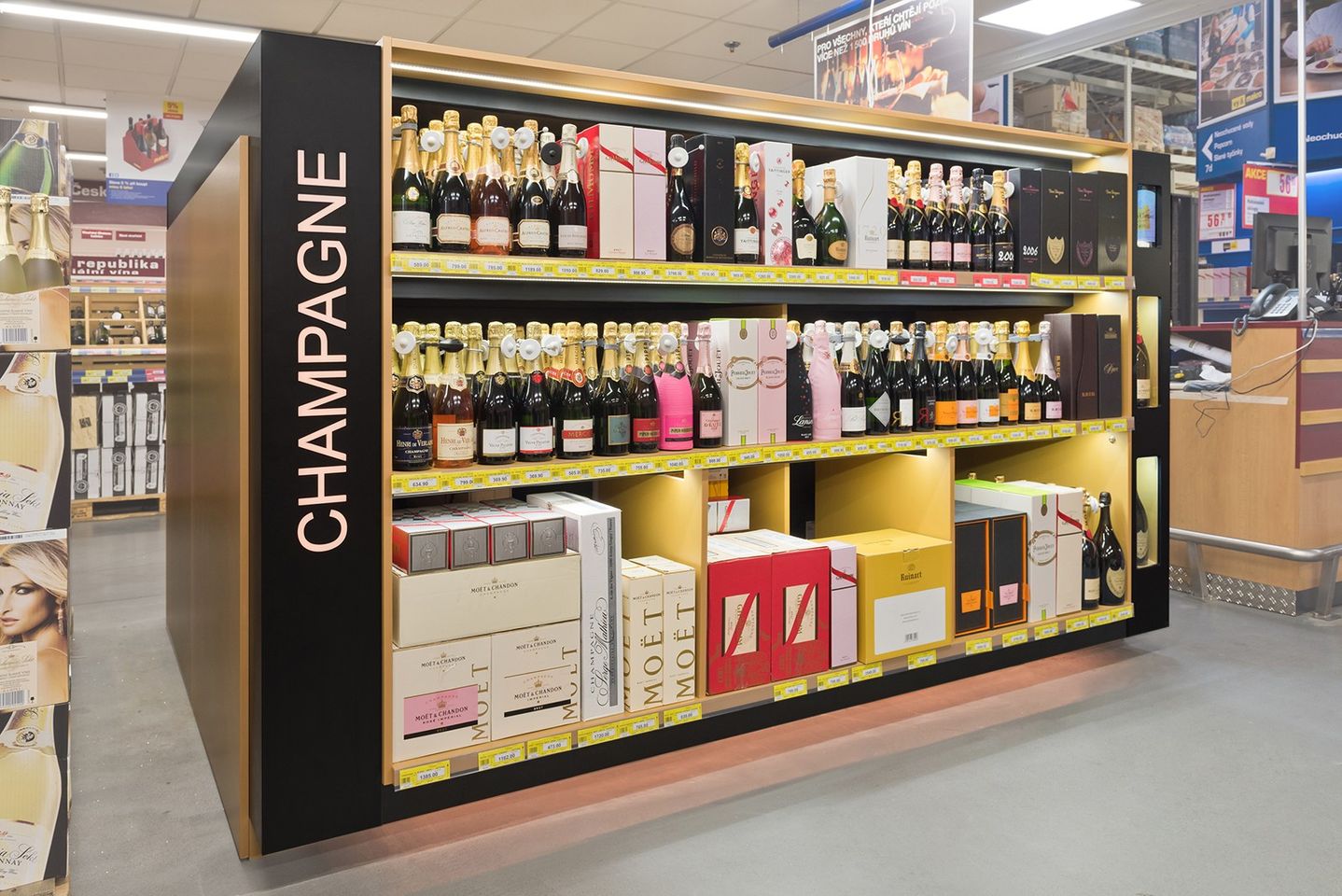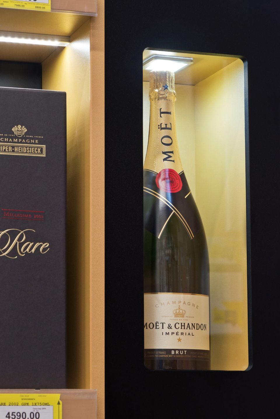 The client was given more space for their products in the Makro wholesale store. We created a distinctive stand-alone shelf for them, designed to attract customers in the wine section and thus promote sales of premium champagne. The entire body is made of laminate and reinforced with a structure of jackel profiles. The shelves are illuminated by LED diodes. RGB LED diodes are used on the plinth and the CHAMPAGNE sign to achieve a yellow color reminiscent of the gold used in the MOëT brand. The shelf also features a retail tablet with visualizations of the products on sale.