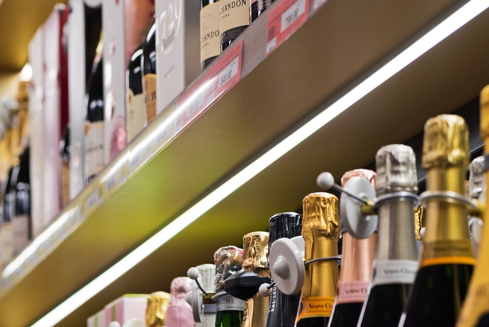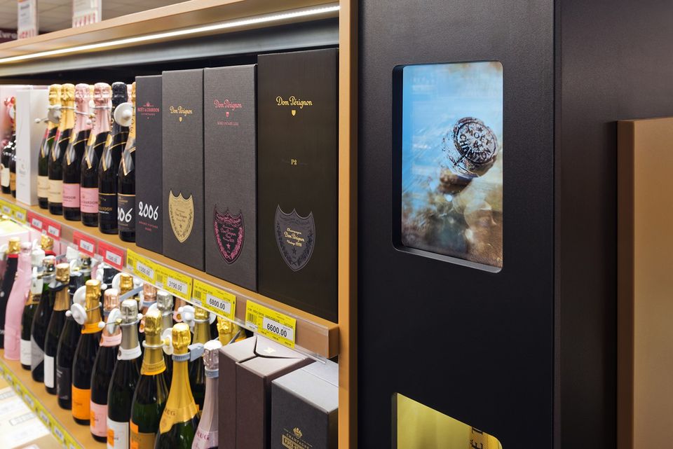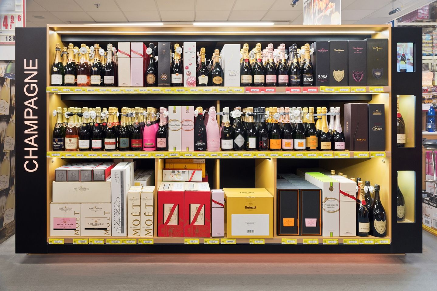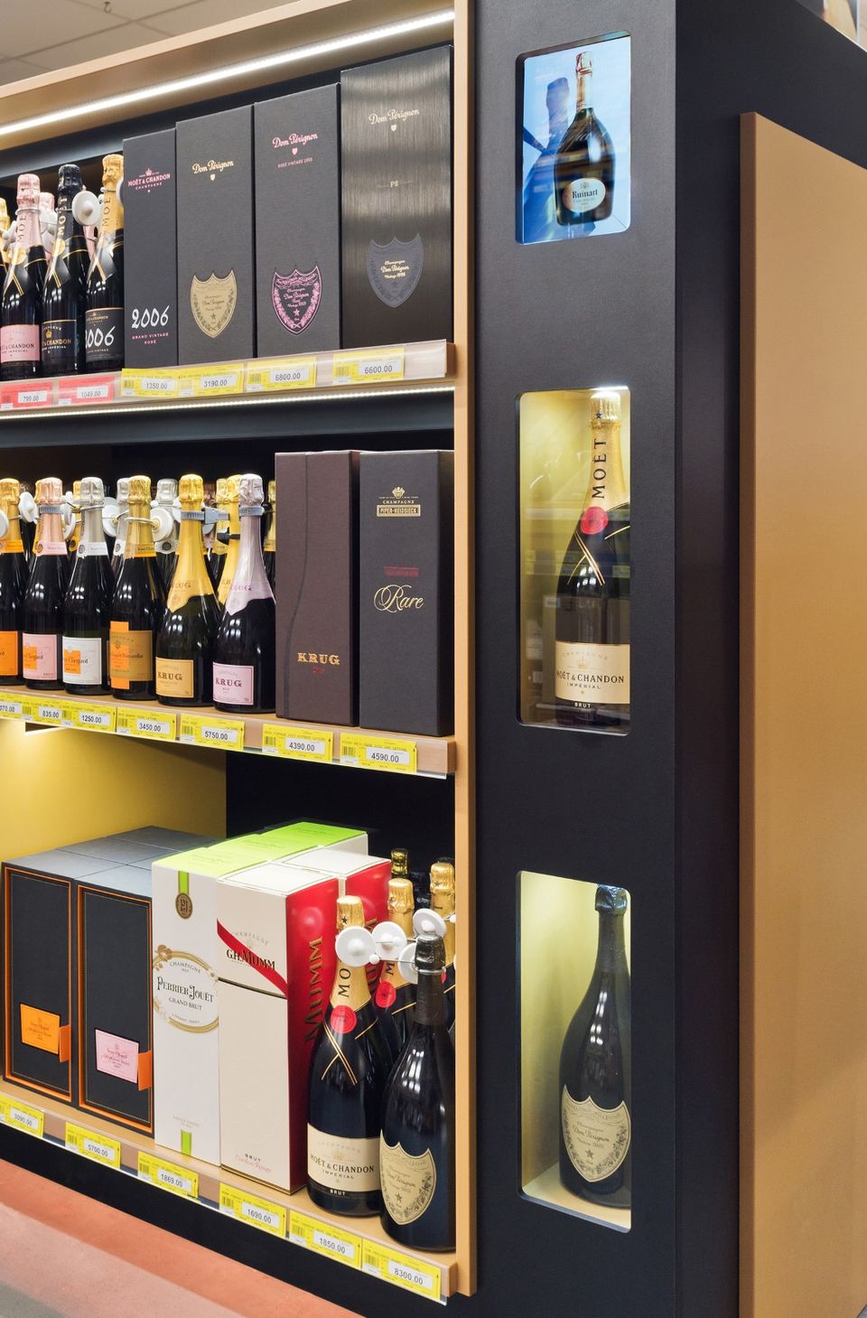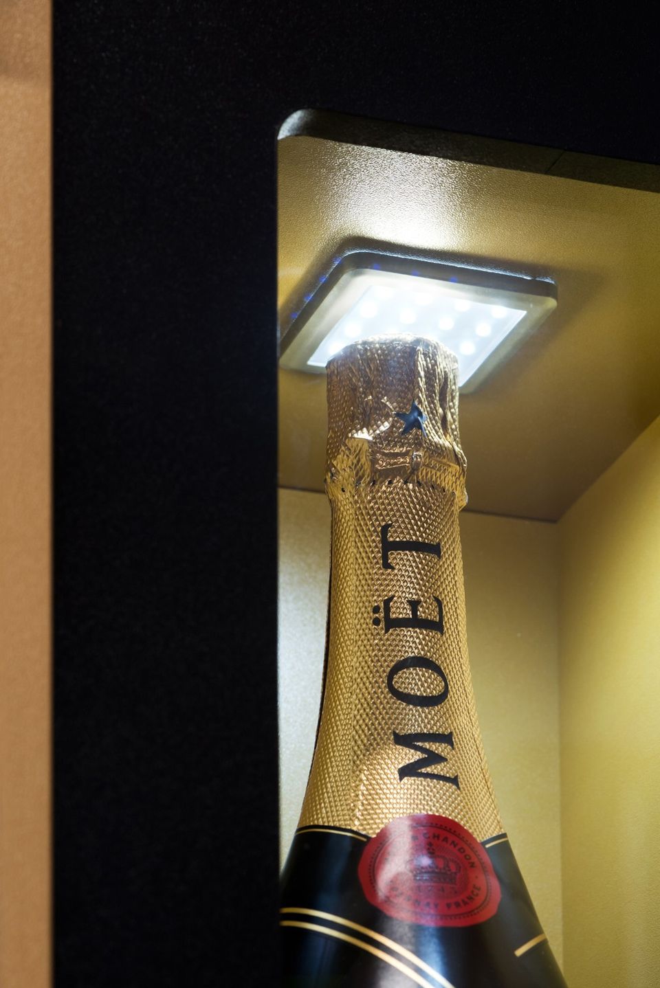 The client was given more space for their products in the Makro wholesale store. We created a distinctive stand-alone shelf for them, designed to attract customers in the wine section and thus promote sales of premium champagne. The entire body is made of laminate and reinforced with a structure of jackel profiles. The shelves are illuminated by LED diodes. RGB LED diodes are used on the plinth and the CHAMPAGNE sign to achieve a yellow color reminiscent of the gold used in the MOëT brand. The shelf also features a retail tablet with visualizations of the products on sale.