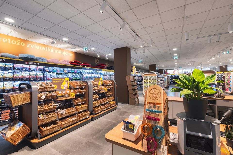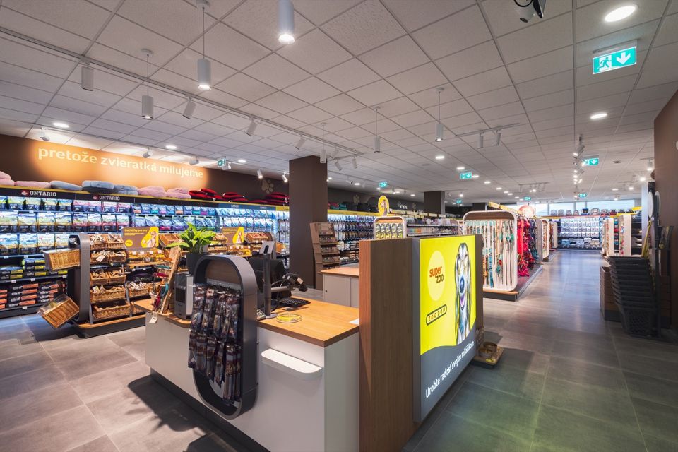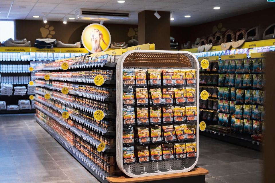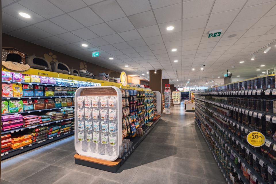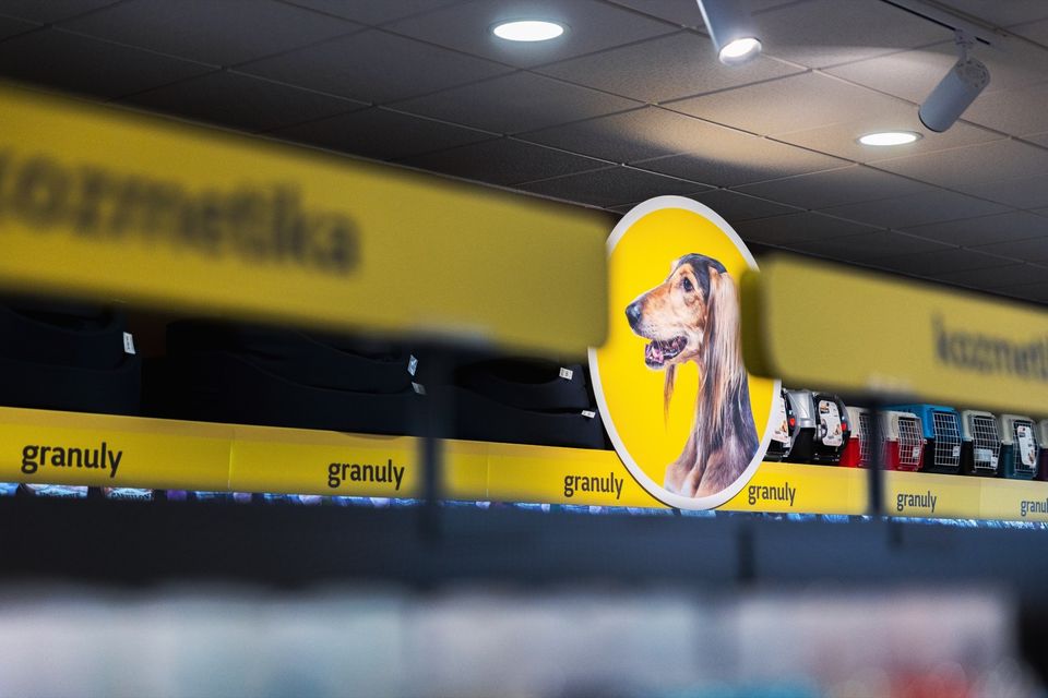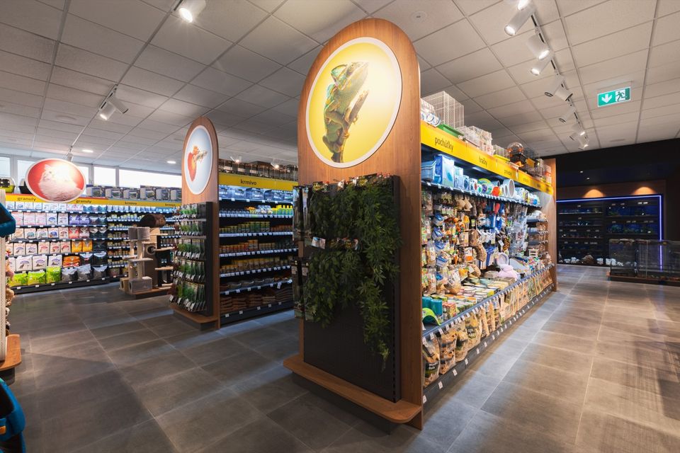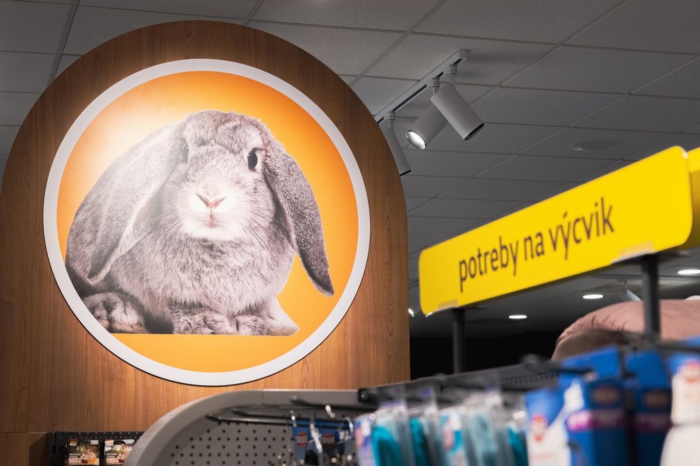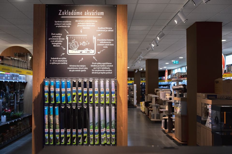 Orientaci na prodejně jsme podpořili informační grafikou a edukativními prvky z naší dílny signmakingu. Velké cedule s vyobrazenými jednotlivými mazlíčky jasně ukazují, kde najdou zákazníci potřeby pro kočičku, psa, papouška nebo rybičky. Členění prodejny je tak zákazníkovi zřejmé hned u vstupu. Podkategorie sortimentu pro jednotlivá zvířata jsou pak jasně značena na regálech. Důmyslné rozestavění gondol, prodejních stojanů a regálů pak nenásilně zákazníka provede celou prodejnou.