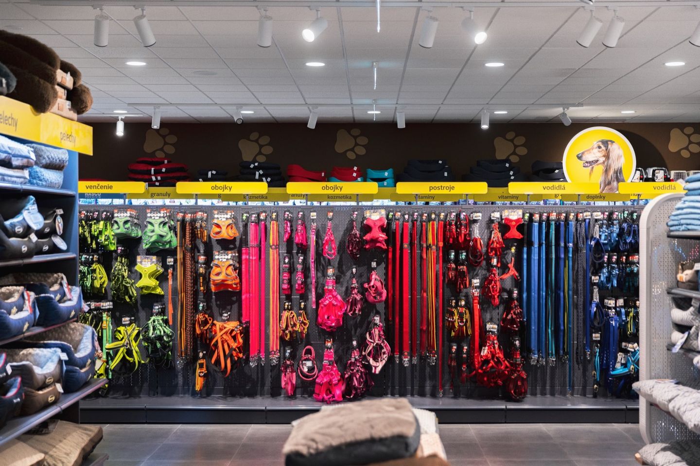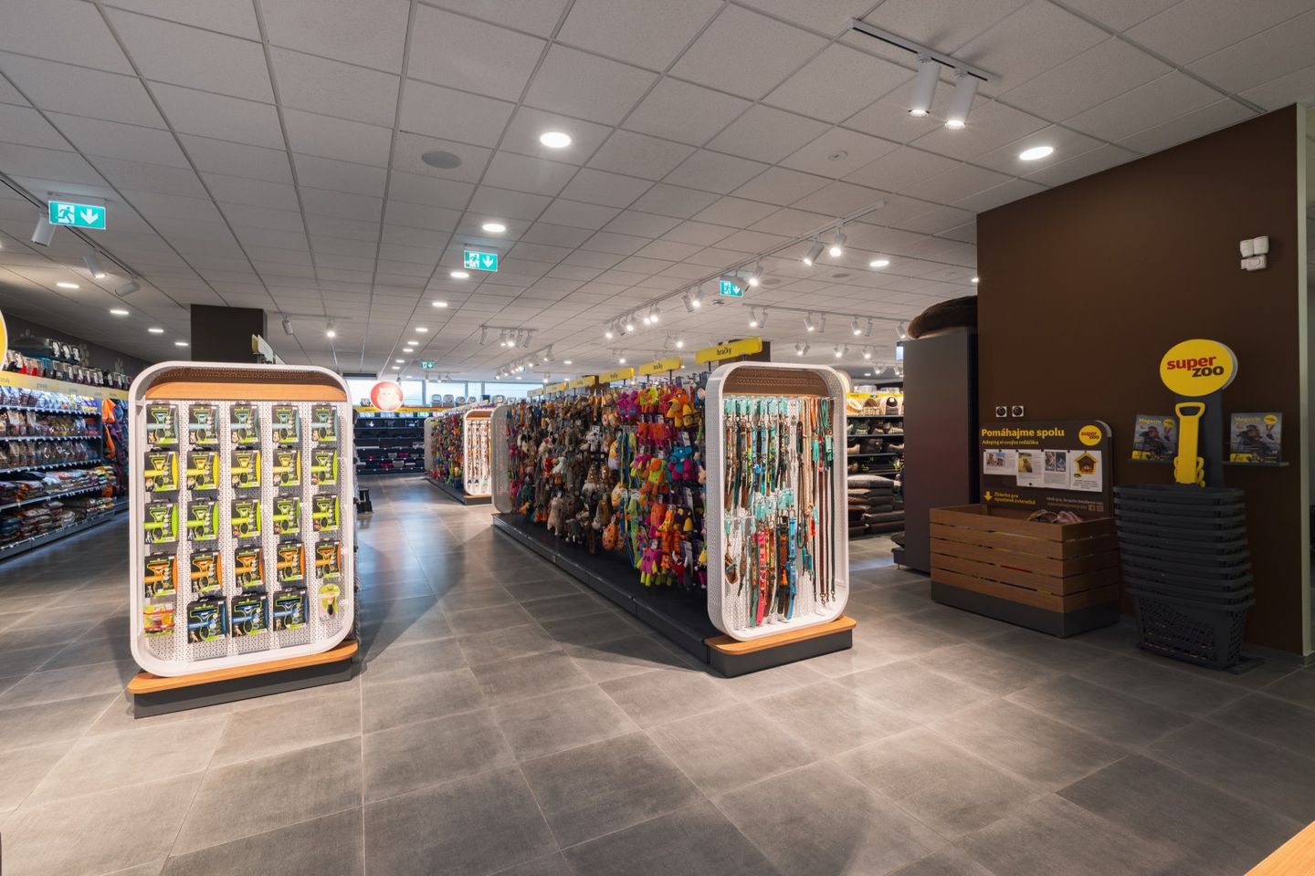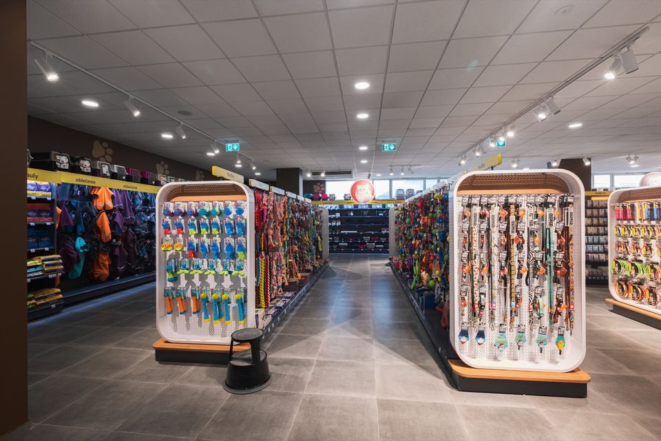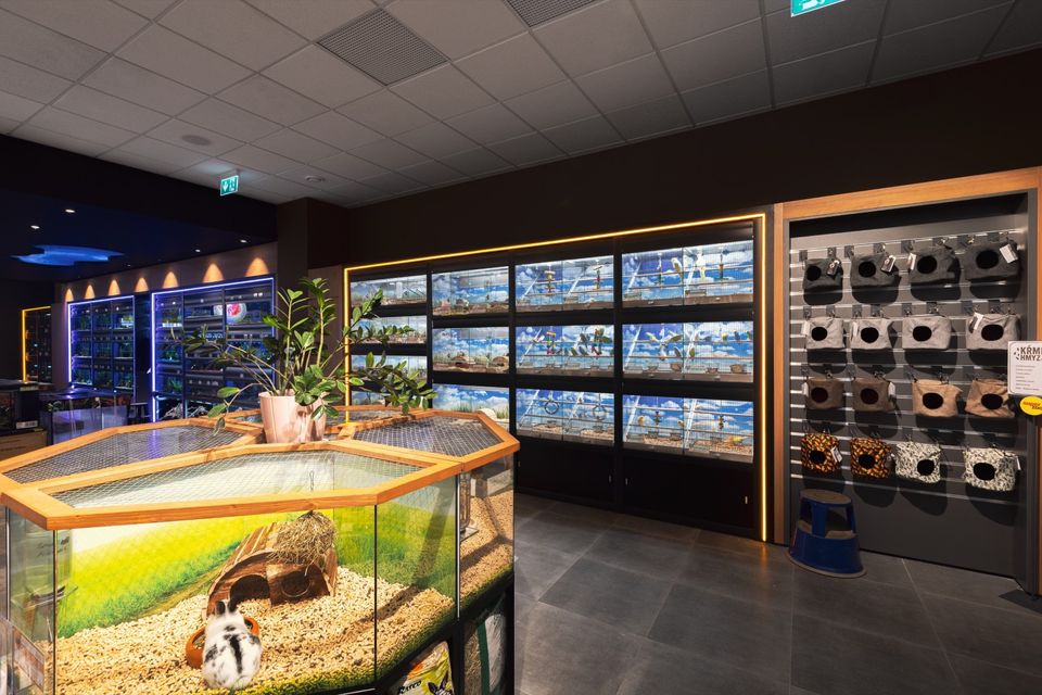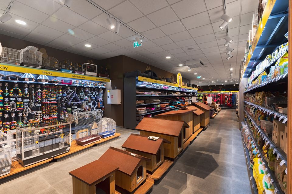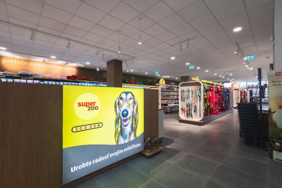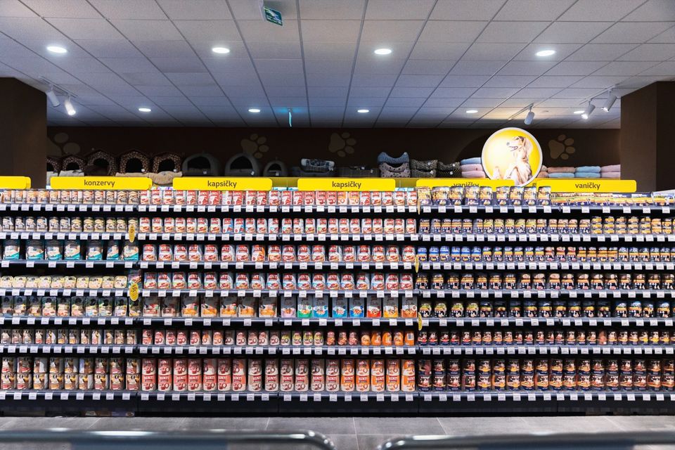 Orientaci na prodejně jsme podpořili informační grafikou a edukativními prvky z naší dílny signmakingu. Velké cedule s vyobrazenými jednotlivými mazlíčky jasně ukazují, kde najdou zákazníci potřeby pro kočičku, psa, papouška nebo rybičky. Členění prodejny je tak zákazníkovi zřejmé hned u vstupu. Podkategorie sortimentu pro jednotlivá zvířata jsou pak jasně značena na regálech. Důmyslné rozestavění gondol, prodejních stojanů a regálů pak nenásilně zákazníka provede celou prodejnou.